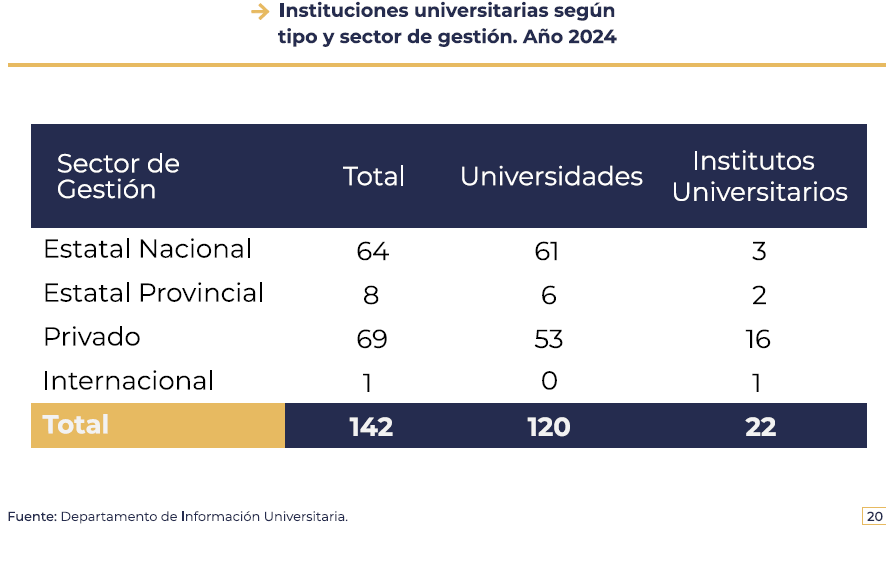 Argentina tiene un sistema universitario compuesto de la siguiente manera según el último informe del año 2024 de la Subsecretaría de Políticas Universitarias[2]: