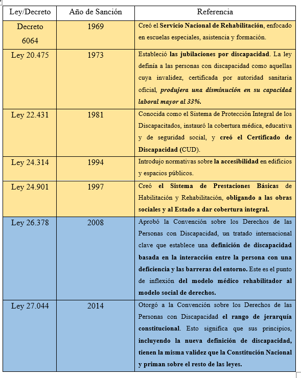 Expongo a modo de resumen un cuadro con las leyes para que quede claro que ya tenemos suficiente marco jurídico nacional a lo que debería agregarse cada legislación provincial (que no abordaré aquí) y para que pueda, a su vez, ser advertido el cambio de paradigma en nuestra legislación que pasó de un modelo médico-rehabilitador a un modelo social de derechos: