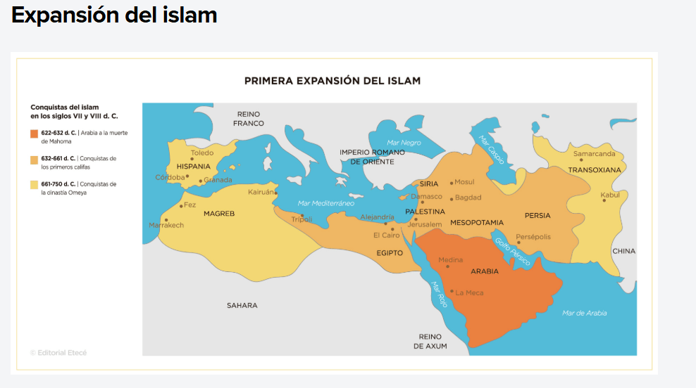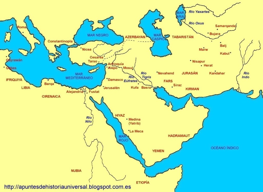 Comenzó la historia de la expansión que con la muerte del profeta Mahoma (año 632) no se detuvo. Muy por el contrario, a pesar de los conflictos internos debido a la sucesión (si por vía hereditaria de sangre o por elección de un hombre justo que dio lugar a los dos grandes grupos: chiítas y sunitas -en disputa hasta la actualidad- no solo por el sistema sucesorio sino también por la interpretación del islam), los diferentes sucesores de Mahoma se lanzaron a la conquista de toda la región.