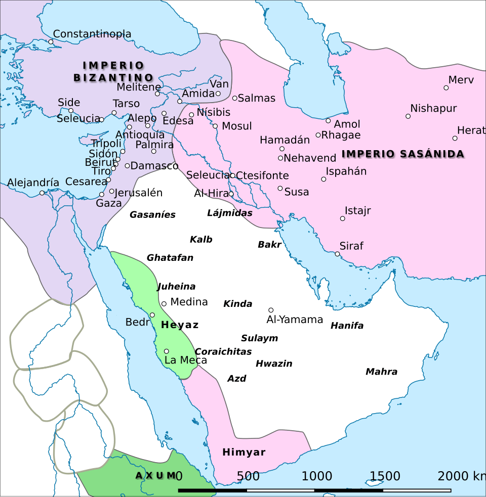 En el siguiente mapa se pueden observar los dos grandes imperios en ese momento, el Imperio Romano o Bizantino y el Imperio Persa o Sasánida y la ubicación de La Meca, así como los principales pueblos árabes: