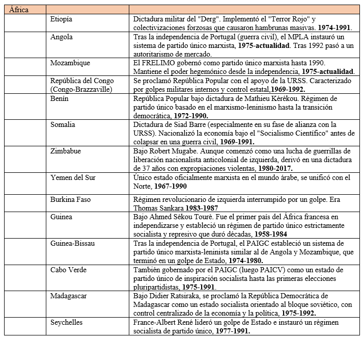 En África, muchos de estos regímenes surgieron de guerras de liberación nacional donde adoptaron el marxismo-leninismo para recibir apoyo de la URSS en sus luchas por la independencia, se caracterizaron por la nacionalización de recursos naturales y una fuerte presencia militar en el gobierno, pero terminaron como dictaduras militares o personales.