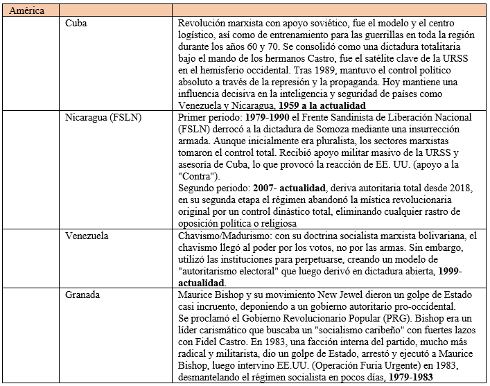 En América los regímenes surgieron de movimientos de liberación nacional o guerrillas internas que se alinearon con el marxismo y que tuvieron respaldo de la URSS.
