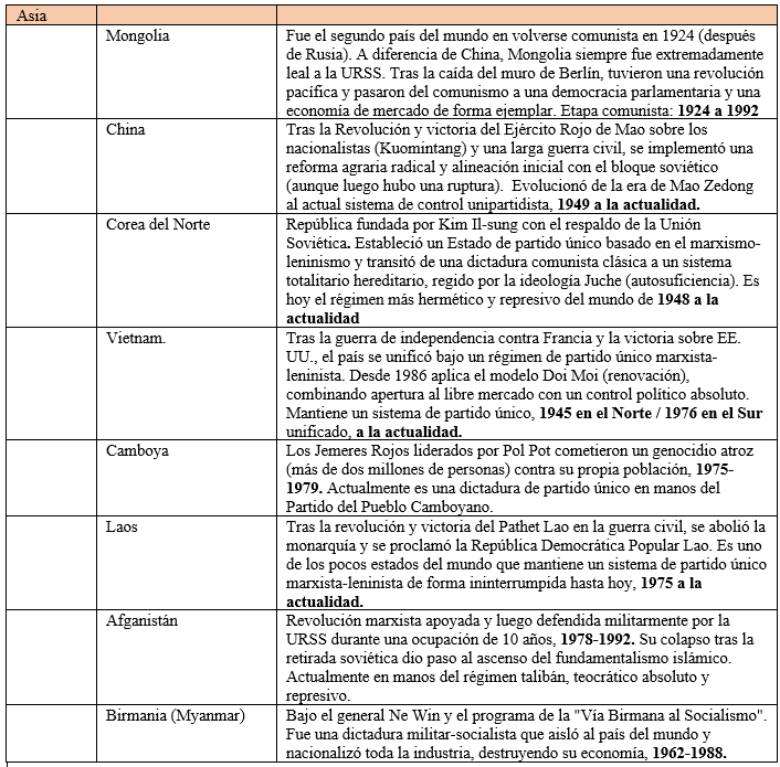 ASIA (8 Estados) China, Corea del Norte, Vietnam, Laos, Mongolia, Afganistán, Camboya, Yemen del Sur.