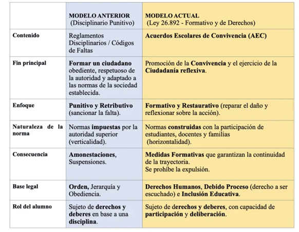 Incluso se sancionó una ley nacional en el año 2013 que establece esto, la ley 26.892, Ley para la Promoción de la Convivencia y el Abordaje de la Conflictividad Social en las Instituciones Educativas, que luego cada provincia debió adecuar para su aplicación a través de las reglamentaciones jurisdiccionales.