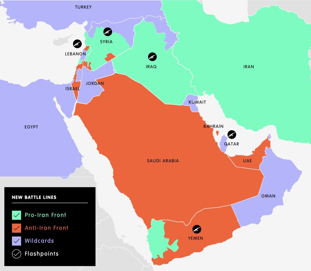 El mapa a continuación nos muestra los países -o porciones de territorio- proiraníes (verde), los países opositores al régimen (naranja) y los países comodines (en celeste, willcards) que no son aliados ni enemigos de Irán, pero sí son aliados de Estados Unidos y navegan en un frágil equilibrio con sus propios intereses en la región[2]: