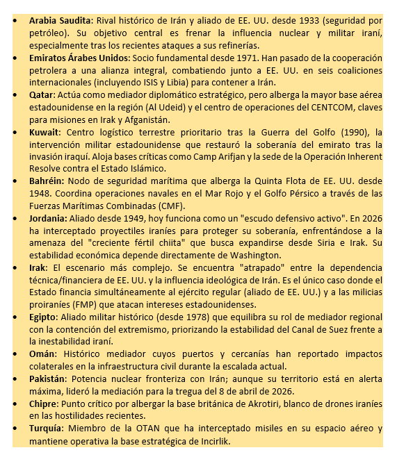 Los países de la región aliados a Estados Unidos no quieren el avance del régimen teocrático de Irán sobre sus territorios ya que están en un momento histórico de creciente autonomía económica y vidriosa estabilidad política interna, la diplomacia es por demás frágil, las consecuencias propias de la vecindad con la guerra desatada en el patio de sus casas pueden provocar o reactivar conflictos locales, especialmente de aquellos sectores que han aceptado la riqueza de la mano estadounidense pero nunca asimilaron sus alianzas…todo es complejo.